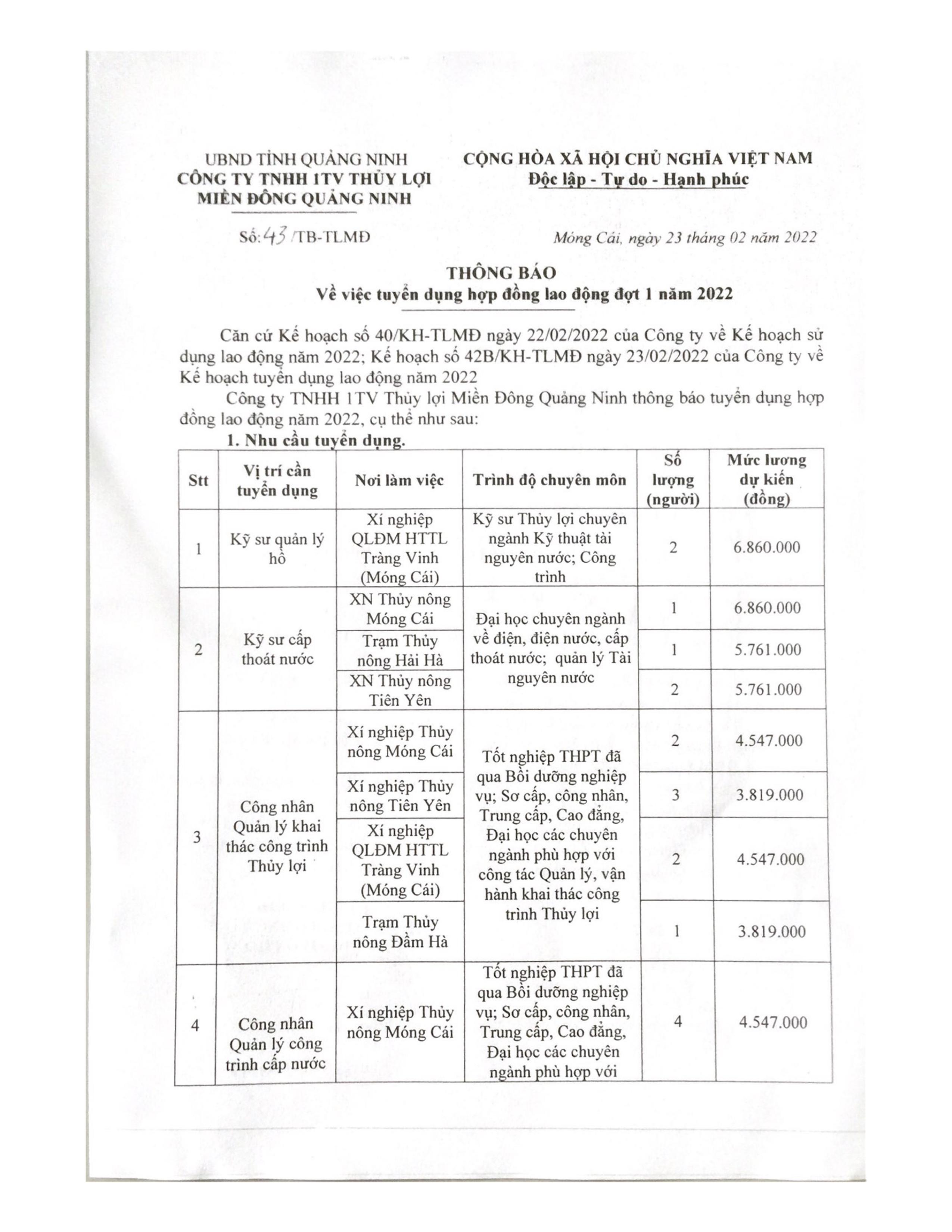 Thông báo về việc tuyển dụng Hợp đồng lao động đợt 1 năm 2022