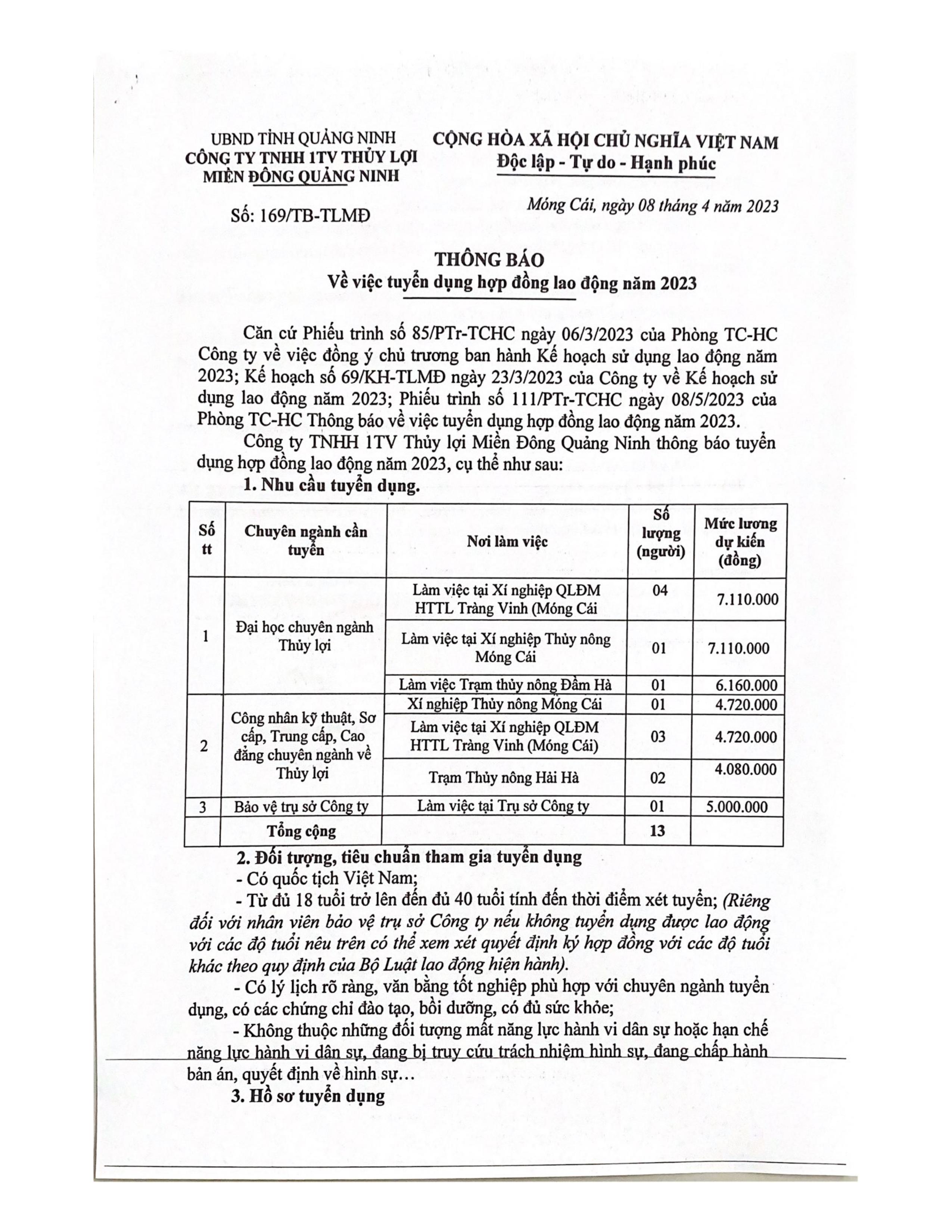 THÔNG BÁO TUYỂN DỤNG HỢP ĐỒNG LAO ĐỘNG NĂM 2023
