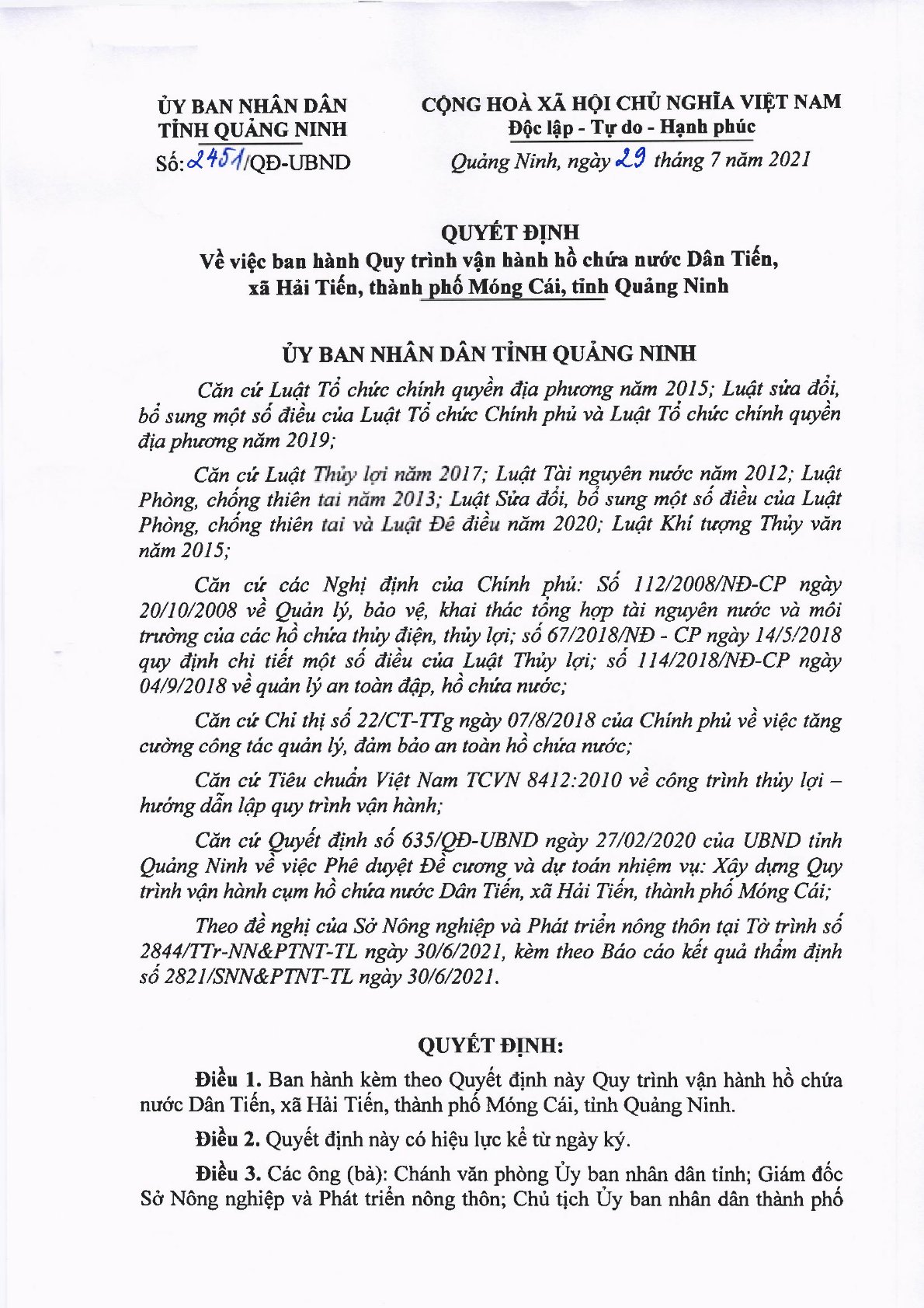 Quy trình vận hành hồ chứa nước Dân Tiến ban hành theo Quyết định số 2451/QĐ-UBND ngày 29/7/2021 của UBND tỉnh Quảng Ninh