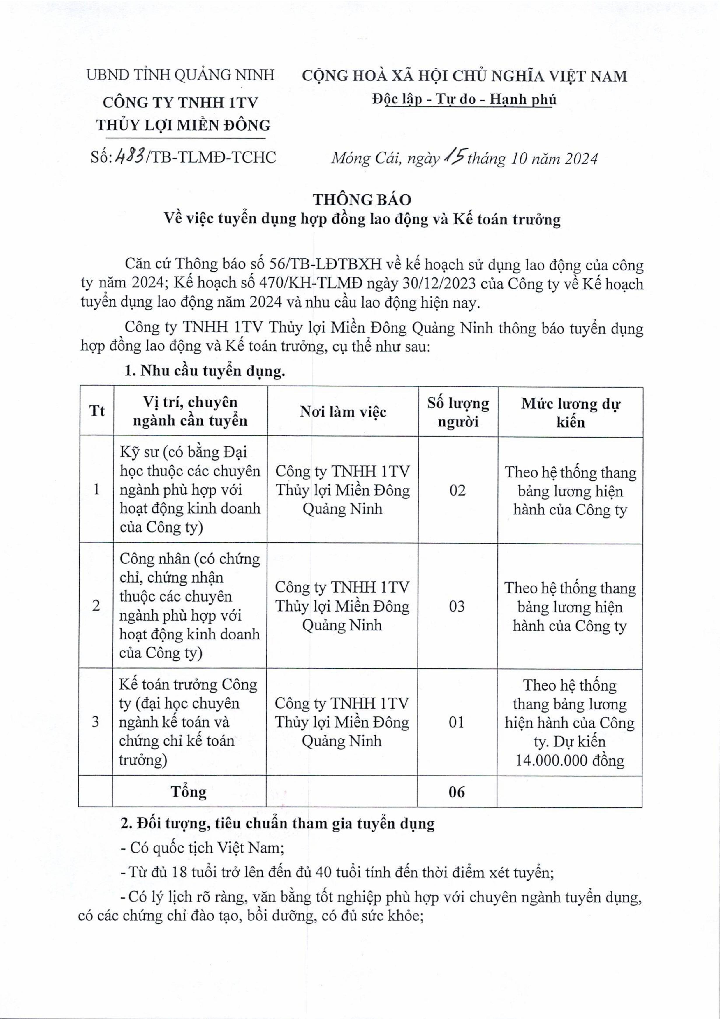 Thông báo tuyển dụng hợp đồng lao động và kế toán trưởng năm 2024