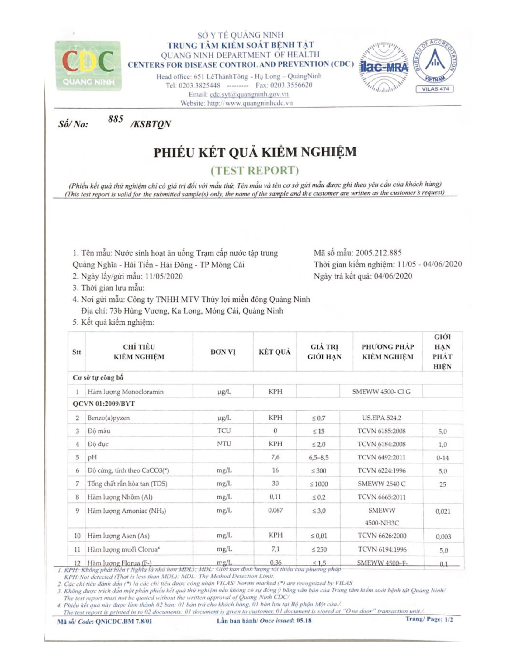 KẾT QUẢ KIỂM ĐỊNH CHẤT LƯỢNG NƯỚC SINH HOẠT TẠI CÁC CÔNG TRÌNH CẤP NƯỚC TẬP TRUNG DO CÔNG TY QUẢN LÝ