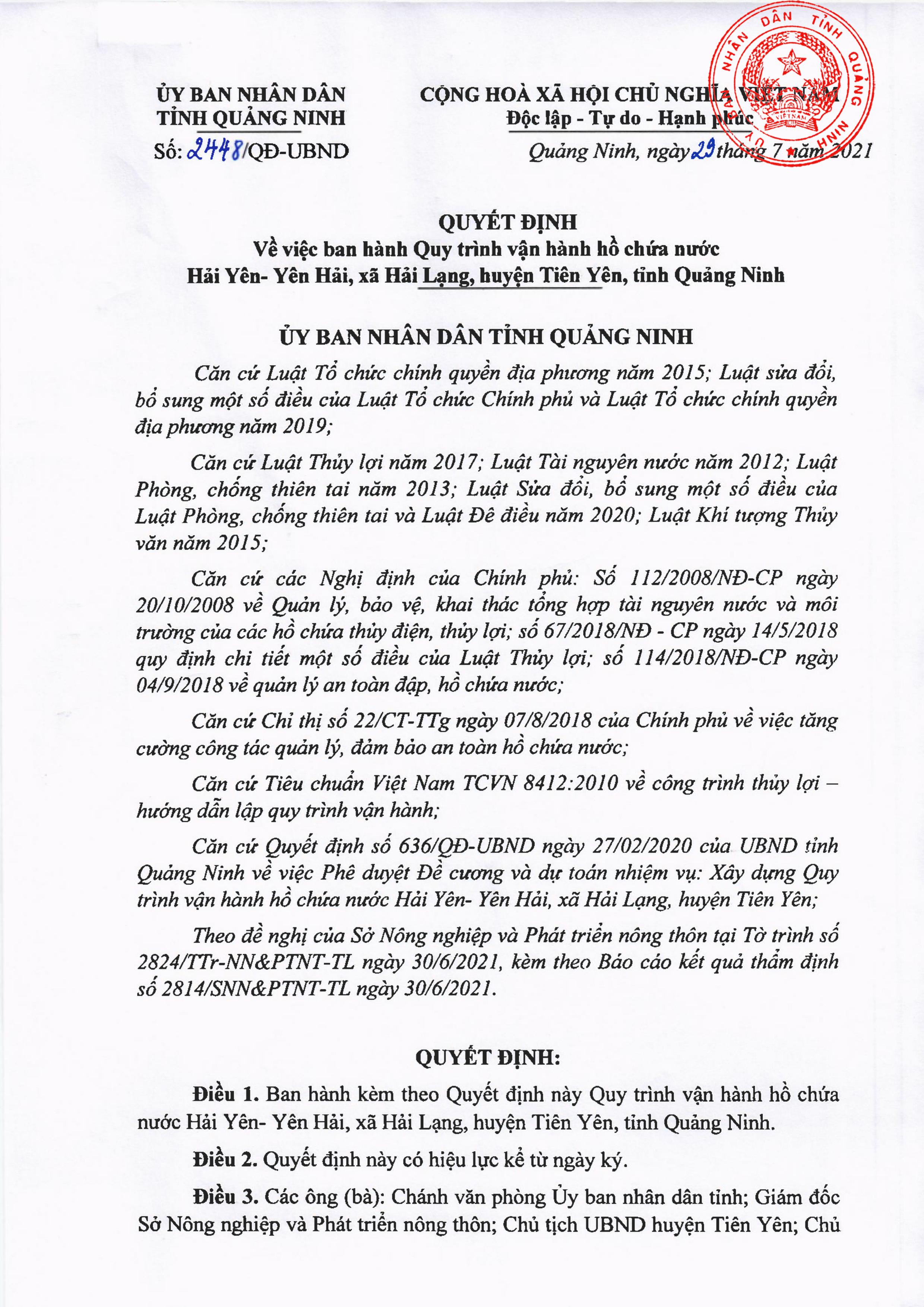 Quy trình vận hành hồ chứa nước Hải Yên - Yên Hải, xã Hải Lạng, huyện Tiên Yên, tỉnh Quảng Ninh